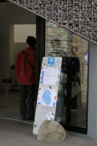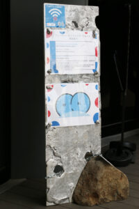 石川県の株式会社金森合金が制作したものです.同社は,大阪・関西万博の未来社会ショーケース事業サプライヤーとして「Co-Design Challenge 2024」に参画しました.2024年1月1日に起こった能登半島地震で倒壊した建物のアルミサッシ等を回収し,その災害廃材を溶解・精錬して,砂型鋳造したサインスタンドです.万博会場では,3基設置されています.