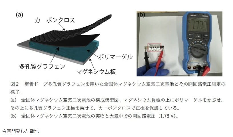 筑波大学は2月16日、安価なマグネシウム金属を負極、多孔質グラフェンを正極に採用し、電解液を固体化することで液漏れしない全固体マグネシウム空気二次電池を開発したと発表した。
