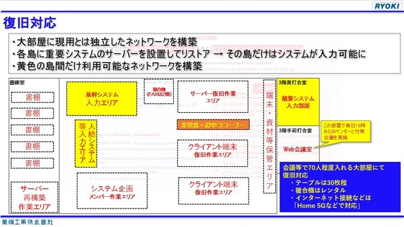 部屋の中には、サーバ復旧エリアやクライアント復旧エリアのほか、基幹システムの入力エリアと積算システムの入力エリア、人給システム等入力エリアという3つの島を設けてバックアップから重要なシステムをリストアし、これらをつなぐ閉じたネットワークを構築して、この部屋の中だけで業務を行う形とした。データ入力を支援する派遣社員も依頼したという。