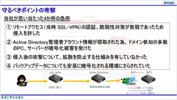 最近のランサムウェア攻撃でも、外部に面したVPN機器やリモートデスクトップ接続(RDP)から侵害されて社内に入り込まれ、Active Directoryを乗っ取られて、端末やサーバに導入していたさまざまなセキュリティ対策が無効化された上でランサムウェアに感染、システムが正常に動作しなくなるという経緯をたどるケースが典型的だ。