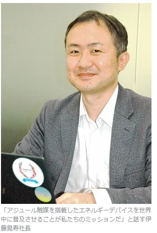 伊藤社長は「レアメタルに頼ることなく、アジュール触媒を搭載したエネルギーデバイス(機器)を世界中に普及させることで、低炭素社会の実現に貢献したい」と語った。
