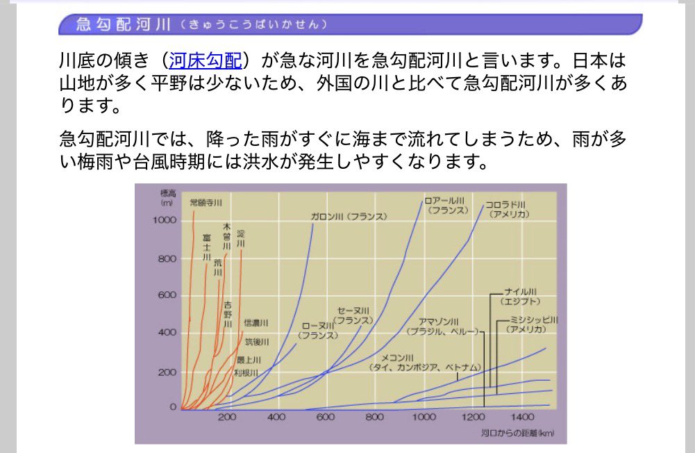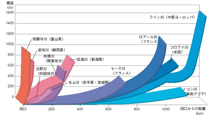 この説明図をみると、日本の川が「滝だ」というのが実感が湧きますね。