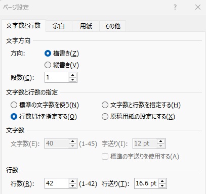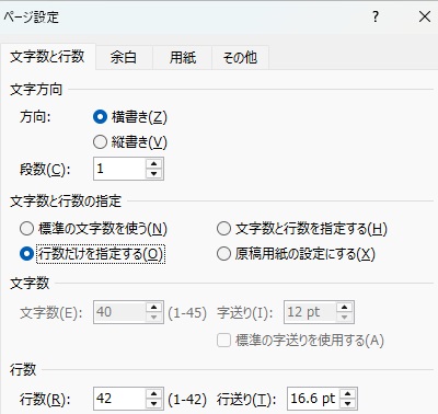 1. レイアウト>ページ設定から行数を変更する(基本)